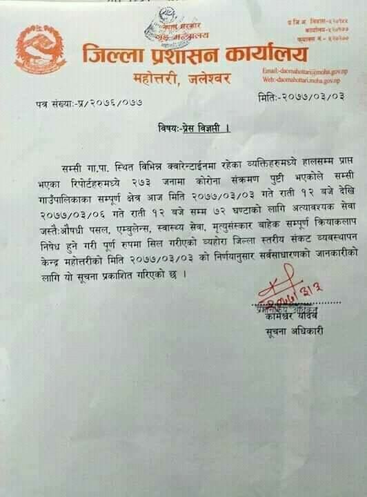 जिल्ला प्रशासन कार्यालय महोत्तरीले एक विज्ञप्ति जारी गर्दै गाउँपालिकाका सम्पूर्ण क्षेत्र ७२ घण्टाका लागि सिल गरिएको जानकारी दिएको हो ।