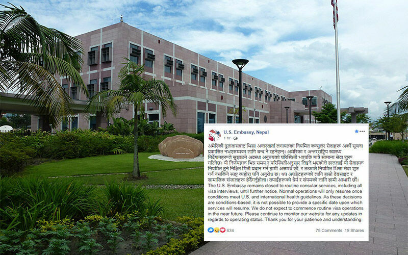 काठमाडौं- नेपालस्थित अमेरिकी दूताबासले एक सूचना जारी गर्दै भिसा अन्तरर्वार्ता लगायतका नियमित कन्सुलर सेवाहरू अर्को सूचना प्रकाशित नभएसम्मका लागि बन्द नै रहने जानकारी दिएको छ ।