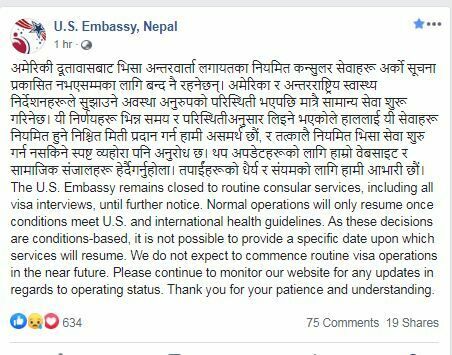 कोरोना भाईरस ‘कोभिड-१९’ को महामारीका कारण यतिबेला संसारभर केही अत्यावश्यक सेवा, र सावधानी अपनाएर गर्न मिल्ने सामान्य कामकाजबाहेक अन्य कामकाज ठप्पप्राय भएको अवस्थामा दूताबासले अमेरिका र अन्तर्राष्ट्रिय स्वास्थ्य निर्देशनहरूले सुझाउने अवस्था अनुरुपको परिस्थिती भएपछि मात्रै सामान्य सेवा शुरू गरिने जनाएको हो ।