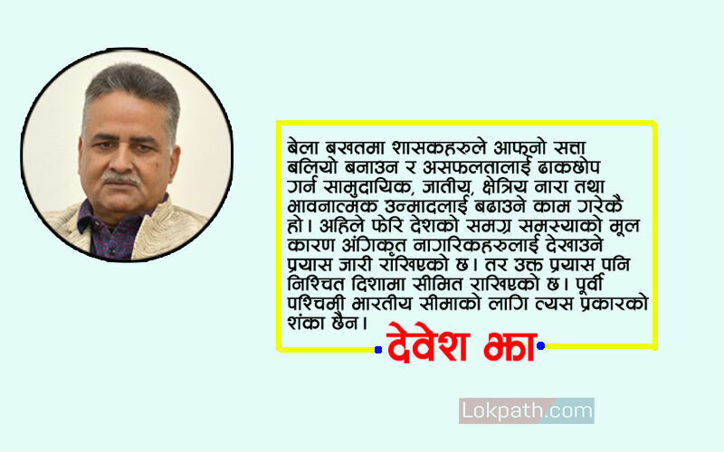 बेलाबखतमा शासकहरुले आफ्नो सत्ता बलियो बनाउन र असफलतालाई ढाकछोप गर्न सामुदायिक, जातीय, क्षेत्रिय नारा तथा भावनात्मक उन्मादलाई बढाउने काम गरेकै हो। अहिले फेरि देशको समग्र समस्याको मूल कारण अंगिकृत नागरिकहरु लाई देखाउने प्रयास जारी राखिएको छ। तर उक्त प्रयास पनि निश्चित दिशामा सीमित राखिएको छ। पूर्वी र पश्चिमी भारतीय सीमा कोलागि त्यस प्रकारको शंका छैन।