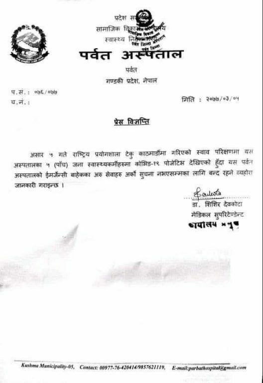 काठमाडौं । पर्वत अस्पतालमा कार्यरत ५ स्वास्थ्यकर्मीमा कोरोना संक्रमण देखिएको छ ।