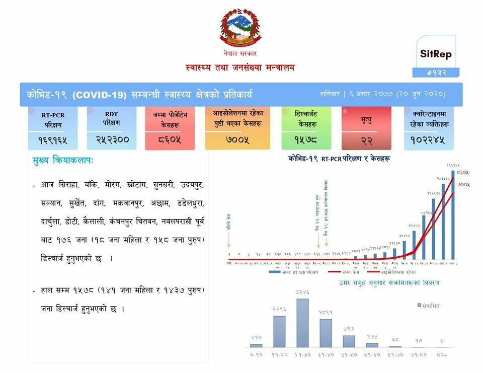 स्वास्थ्य तथा जनसंख्या मन्त्रालयका अनुसार बितेको २४ घण्टामा थपिएका संक्रमितसँगै नेपालमा कुल कोरोना संक्रमितको संख्या ८ हजार ६०५ पुगेको छ । कुल संक्रमितमध्ये ७ सय ५६ जना महिला र ७ हजार ८ हजार ४९ जना पुरुष रहेका छन् ।
