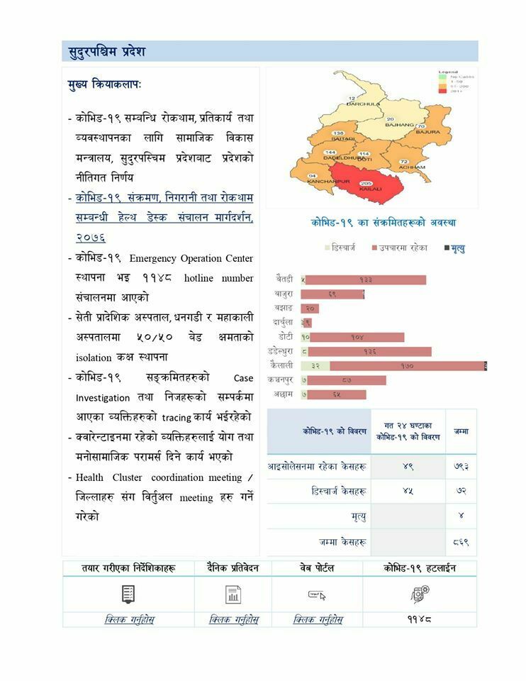 राष्ट्रिय जनस्वास्थ्य प्रयोगशाला टेकुमा गरीएको परीक्षणमा : बाराका १ जना महिला बाग्लुङका १ जना महिला र १३ जना पुरुष बैतडीका १८ जना पुरुष गुल्मीका २ महिला र १६ पुरुष डडेल्धुराका ५ महिला र ७ पुरुष डोटीका ९ महिला र ५२ पुरुष कैलालीका १ पुरुष र काठमाडौंका १ महिला नवलपरासी पूर्वका ३ महिला र १४ पुरुष नवलपरासी पश्चिमका १ जना पुरुष पाल्पाका १ जना पुरुष रामेछापका १ जना महिला र २ जना पुरुष रौतहटका २ जना पुरुष रुपन्देहीका १ जना पुरुष र सर्लाहीका ६ जना पुरुष गरी जम्मा १५७ जना