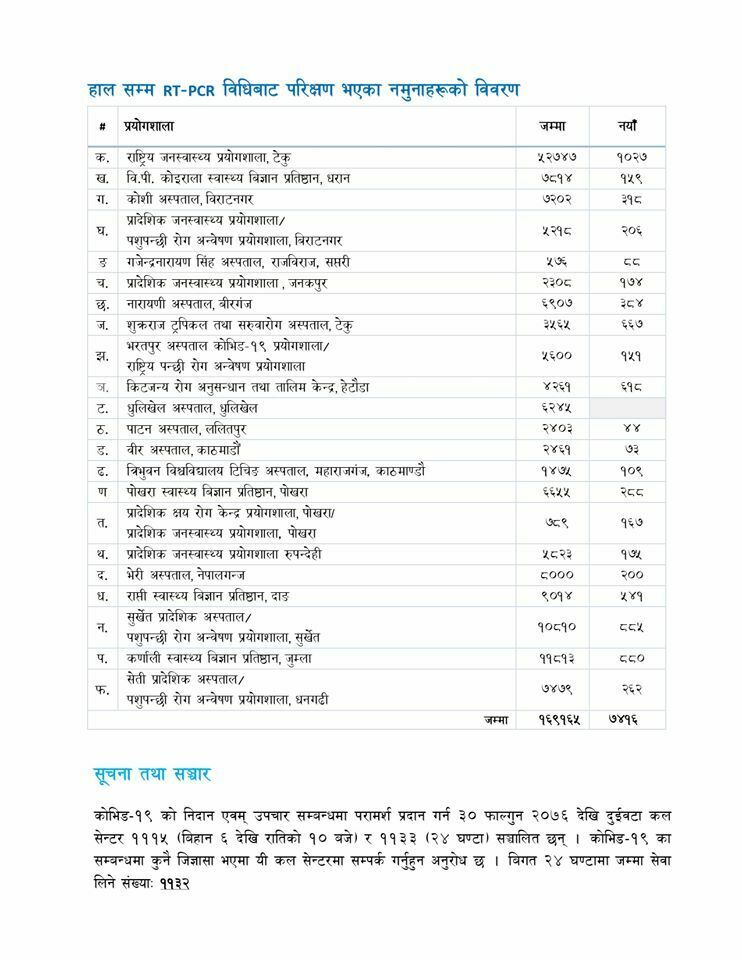 प्रादेशिक जनस्वास्थ्य प्रयोगशाला रुपन्देहीमा गरीएको परीक्षणमा : पाल्पाका ४ महिला १२ पुरुष गरी १६ जना