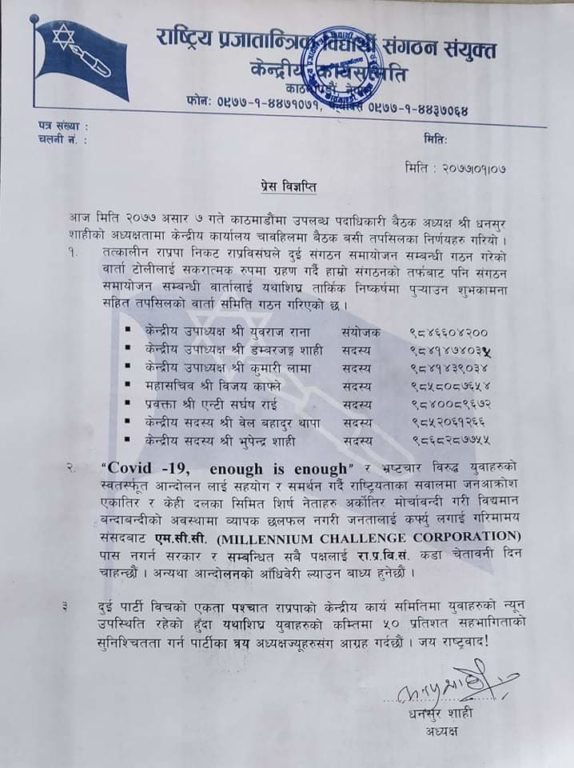 विद्यार्थी संगठनको राजधानीमा उपलब्ध पदाधिकारीको आइतबार सम्पन्न वैठकले तत्कालीन राप्रपा निकट विद्यार्थी संगठनसँग समायोजनका लागि वार्ता गर्न सात सदस्यीय वार्ता टोली गठन गरेको छ । वार्ता समितिको संयोजकमा उपाध्यक्ष युवराज राना, सदस्यहरूमा डम्बरजङ्ग शाही, कुमारी लामा, विजय काफ्ले, एन्टीसंघर्ष राई, बेलबहादुर थापा र भूपेन्द्र शाही छन् ।