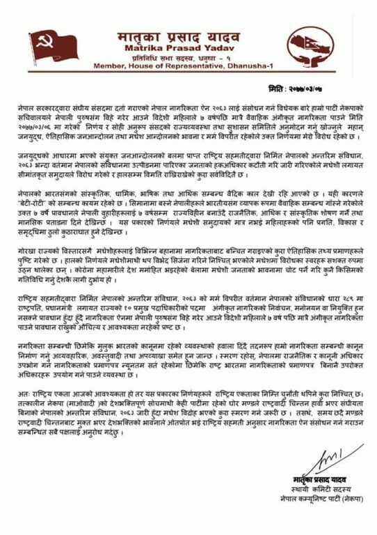 उनले भनेका छन्, “नेपाल नागरिकता ऐन २०६३ लाई संशोधन गर्न बनेको विधेयक बारे हाम्रो पार्टी नेकपाको सचिवालयले गरेको निर्णयप्रति पूर्ण असहमति छ । उक्त ७ वर्षे प्रावधानले ७ वर्षसम्म राज्यविहीन बनाउँदै राजनैतिक, आर्थिक र साँस्कृति शोषण गर्ने र मानसिक प्रताडना दिने देखिन्छ । यस प्रकारका निर्णयले मधेशी समुदाय मात्र नभई समग्र महिलाहरूको पनि प्रगति, विकास र समृद्धिमा ठुलो कुठाराघात हुने देखिन्छ ।”