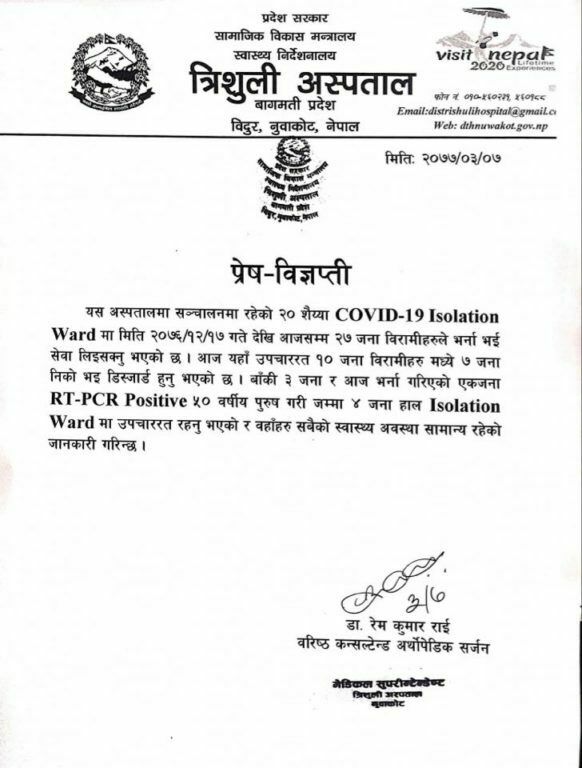 नुवाकोट । नुवाकोटको त्रिशुली अस्पतालमा सञ्चालन गरिएको २० शैयाको कोभिड १९ आइसोलेसन सेन्टर मार्फत हालसम्म २७ जना बिरामीले सेवा लिएका छन् । गत चैत १७ गतेदेखि सञ्चालनमा आएको उक्त सेन्टरमा भर्ना भएका १० जना मध्ये ७ जना उपचारपछि निको भएर घर फकिसकेको अस्तालले जनाएको छ ।