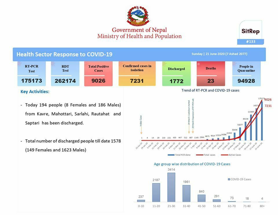 उनले भने – ‘नेपालमा ९२ प्रतिशत पुरुष छन् र १५ देखि ५४ वर्ष उमेरका छन् यो हेर्दा के बुझिन्छ भने उहाँहरु सबै जसो श्रमको लागि विदेश जानु भएको छ र फर्किदा संक्रमित भएर नेपालमा आएको अवस्था देखिन्छ । उनले थपे – ‘यि संक्रमितमध्ये ९८ प्रतिशत लक्षणहरु छैन त्यो भएको हुनाले हाम्रो नेपालमा अहिलेसम्म आएका व्यक्तिहरुमा गम्भीर खालको बिरामी धेरै कम छ र सबै जसो संक्रमित विदेशका हुनुहुन्छ । फर्केर नेपाल आउँदा पोजेटिभ देखिन्छ ।’