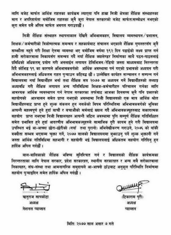 प्याब्सन र एन प्याब्सनले विद्यालयको भाडा तिर्न नसकिएको, बैंकको ऋणको साँवा, व्याज र किस्ता बुझाउन नसकिएको स्थितिमा सरकारले उद्योगसरह कुनै राहत प्याकेजमा आफूहरुलाई समावेश गर्नुपर्ने माग पनि गरिएको छ । निजी विद्यालयका प्रशासन भने सञ्चालनमा आइसकेका छन् ।