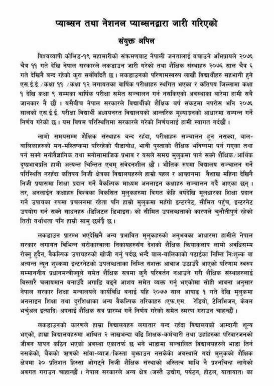 ती संस्थाले बन्दाबन्दीमा अनलाइनबाट कक्षा सञ्चालन हुन थालेकाले निःशुल्क वा अत्यन्त न्यून शुल्कमा सिकाइलाई निरन्तरता दिइएको तर शुल्क नलिँदा आफूहरुलाई कठिनाइ परेको जनाएका छन् । सरकारले अनलाइन कक्षा सञ्चालनबापतको शुल्क लिनेबारे हालसम्म कुनै निर्णय गरेको छैन भने गत चैतमा एक महिनाको शिक्षण शुल्क मिनाहा गर्न निर्देशन गरेको थियो ।