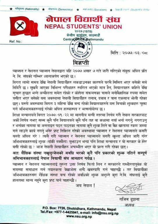 काठमाडौं । नेपाली कांग्रेसको भ्रातृ संस्था नेपाल विद्यार्थी सङ्घले शैक्षिक संस्था पूर्णरुपमा नखुलेसम्म विद्यालयमा कुनै पनि शुल्क नतिर्न अभिभावकलाई आग्रह गरेको छ ।