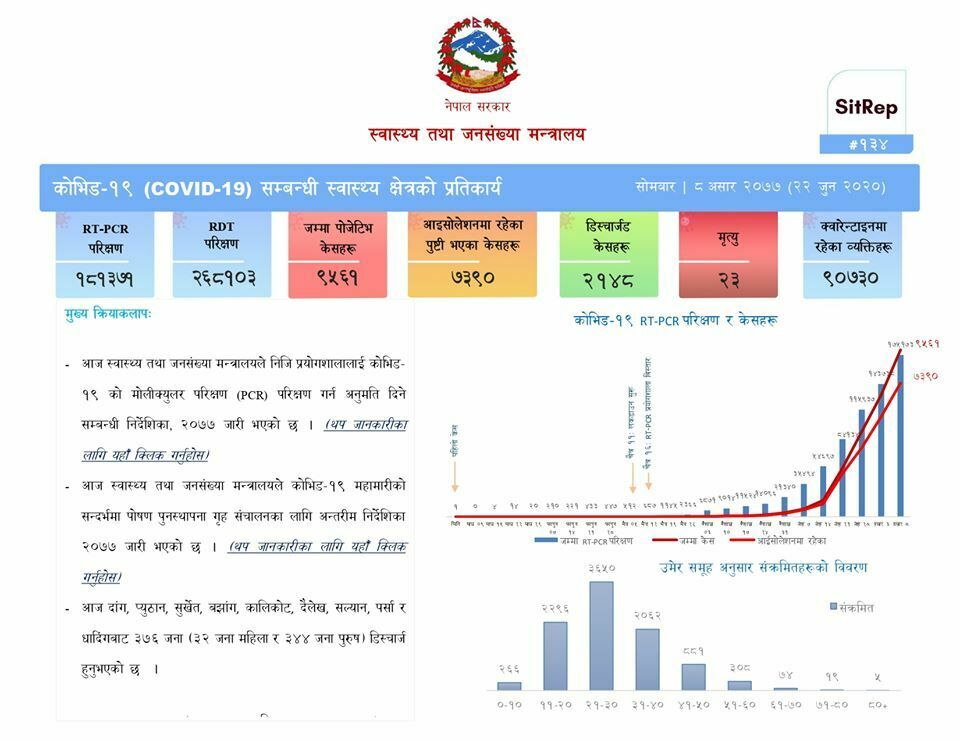 जसमध्ये ८९४ जना महिला छन् भने ८ हजार ६ सय ६७ जना पुरुष छन् । स्वास्थ्य मन्त्रालयको नियमित प्रेस ब्रिफिङमा मन्त्रालयका प्रवक्ता प्रा. डा. जागेश्वर गौतमले बितेको २४ घण्टामा थपिएका संक्रमितहरुको स्वास्थ्य अवस्था सामान्य रहेको जानकारी दिँदै उनीहरु चिकित्सकको निगरानीमा रहेको बताए ।