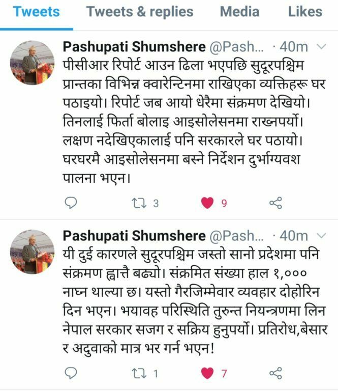 सोमबार ट्वीट गर्दै उनले भने, ‘पीसीआर रिपोर्ट आउन ढिला भएपछि सुदूरपश्चिम प्रान्तका विभिन्न क्वारेन्टिनमा राखिएका व्यक्तिहरू घर पठाइयो । रिपोर्ट जब आयो धेरैमा संक्रमण देखियो । तिनलाई फिर्ता बोलाइ आइसोलेसनमा राख्न पर्यो । लक्षण नदेखिएकालाई पनि सरकारले घर पठायो । घरघरमै आइसोलेसनमा बस्ने निर्देशन दुर्भाग्यवश पालना भएन ।’