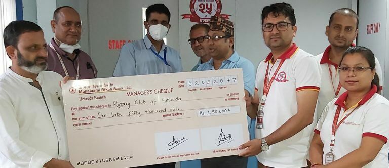 गत असार २ गते बैंकको हेटौंडा शाखामा सम्पन्न कार्यक्रमकाबीच बंैकका शाखा प्रबन्धक शम्भु प्रसाद पराजुलीले रोटरी क्लब अफ हेटौंडाका अध्यक्ष ईन्द्र प्रसाद नेपाललाई एक लाख पचास हजार रकमको चेक हस्तान्तरण गरेका थिए ।