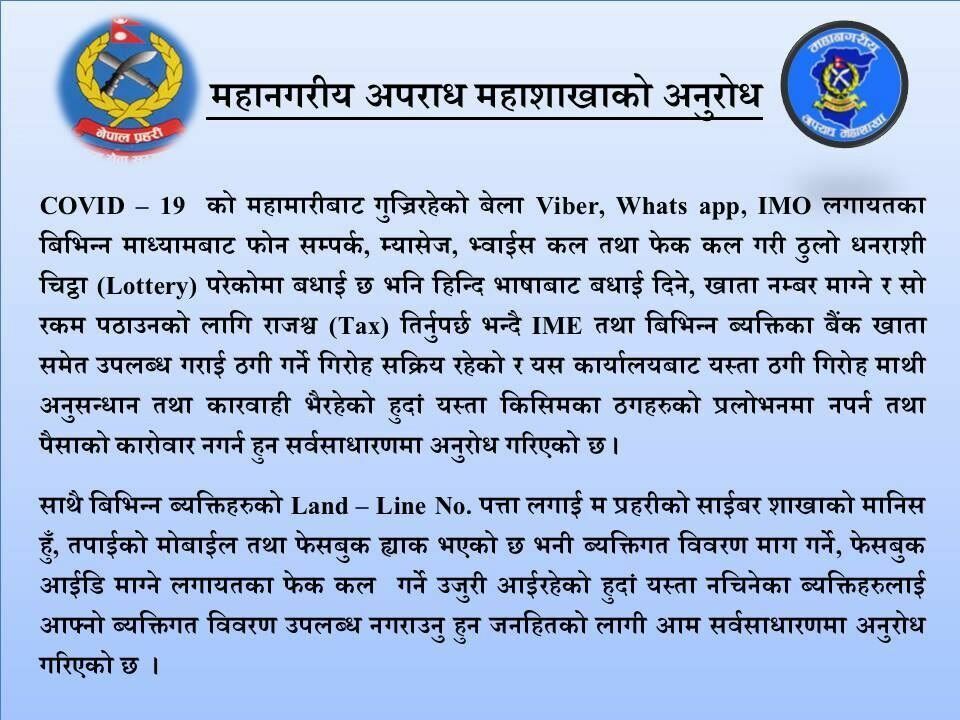 महानगरीय अपराध महाशाखाले एक सूचना जारी गर्दै हिन्दी भाषाबाट बधाइ दिने, बैंक खाता नम्बर माग्ने रसो रकम पठाउनका लागि राजश्व तिर्नुपर्ने भन्दै रकम माग गरेर ठगी हुने गरेको भन्दै त्यस्तो प्रलोभनमा नपर्न अनुरोध गरेको छ ।