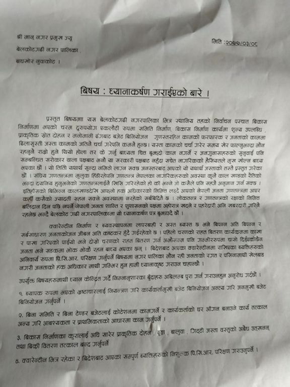 विभिन्न विषयहरुमा नगरपालिकाको ध्यानाकर्षण गराउँदै बेलकोटगढी नगरपालिकाको मेयरका प्रत्यासी एवम् नुवाकोट क्षेत्र नं २ (क) का सभापति यादव नेपाल तथा नगर सभापति गोकुल प्रसाद दाहालले संयुक्त रुपमा मेयर राजेन्द्र रमण खनाललाई ध्यानाकर्षण पत्र बुझाएका हुन् ।