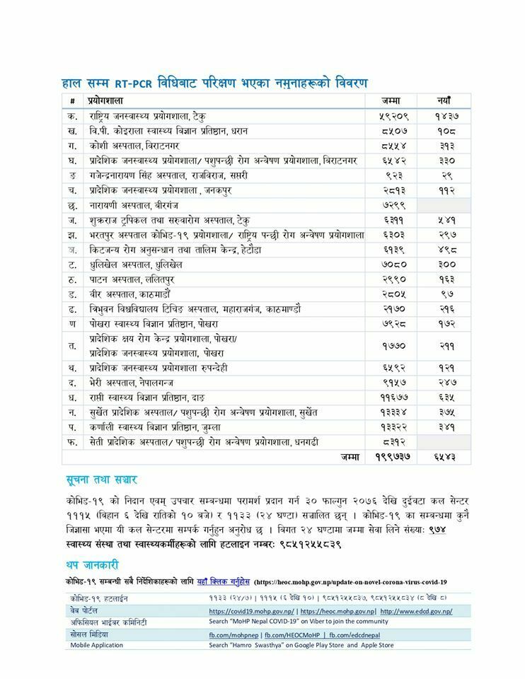 पाटन अस्पताल ललितपुर प्रयोगशालामा गरिएको परिक्षणमा : डोल्पा १ जना पुरुष,काठमाडौंका २ जना महिला र २ जना पुरुष, ललितपुरका १ जना पुरुष र सुनसरीका १ जना पुरुष
