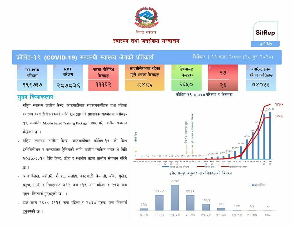 यससँगै नेपालमा कोरोनाको कारण ज्यान गुमाउनेको संख्या २६ पुगेको छ ।