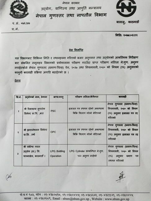 यसैगरी कमल रोलिङ मिल्सलाई स्पष्टीकरण सोधिएको छ भने एभरेस्ट ग्यास उद्योगको सिलिन्डरको मापदण्ड पनि नपुगेकाले प्रमाणपत्र स्थगित गरिएको विभागका प्रवक्ता दिनानाथ मिश्रले जारी गरेको विज्ञप्तिमा उल्लेख छ ।