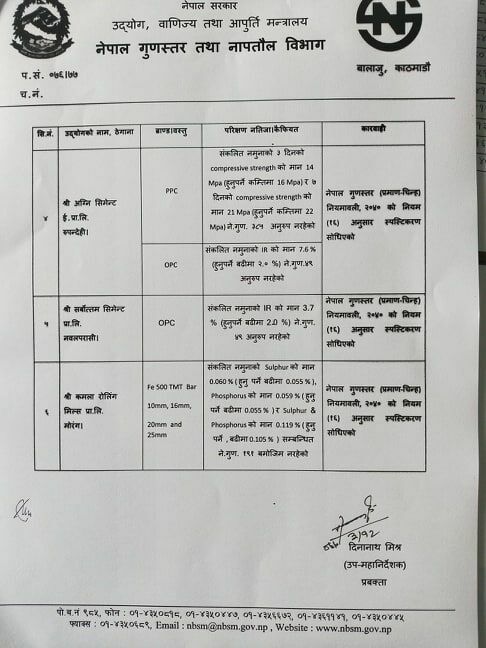 यसैगरी अग्नि सिमेन्ट र सर्बोत्तम सिमेन्टको गुणस्तर मापदण्ड नपुगेको पुष्टि भएकाले स्पष्टीकरण सोधिएको छ।