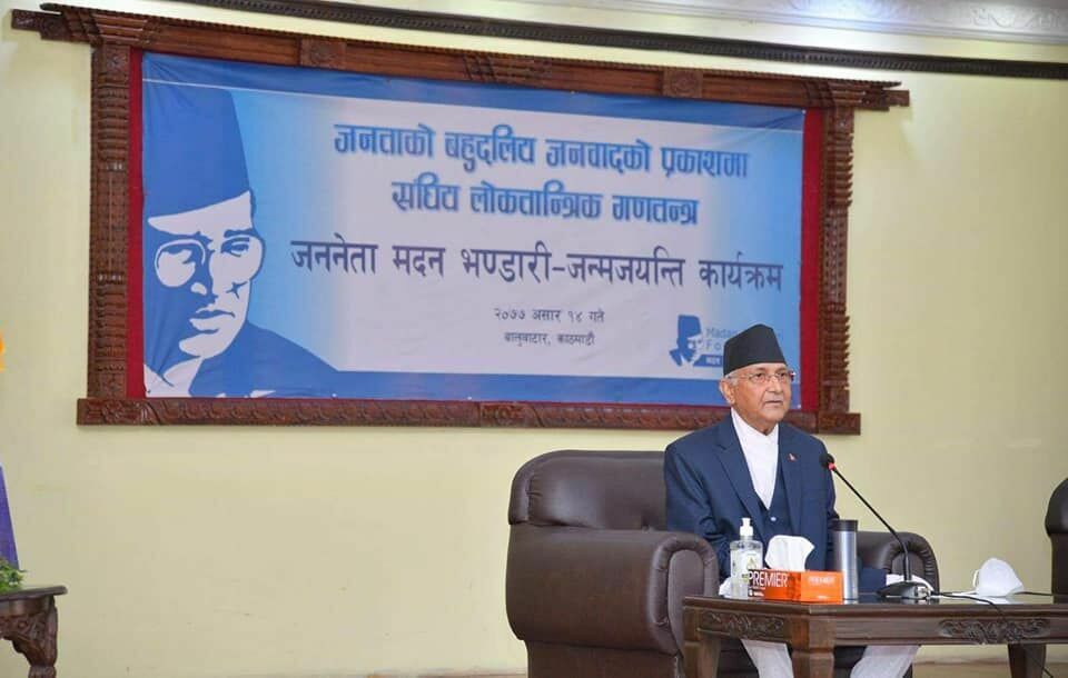 आइतबार मदन भण्डारीको ६९ औं जन्मोत्सवका अवसरमा बालुवाटारमा आयोजित कार्यक्रमलाई सम्बोधन गर्दै प्रधानमन्त्री ओलीले नेपालको नक्सा छापेर संविधान संशोधन गरेवापत प्रधानमन्त्री हटाउने सपना नदेख्न भारतलाई चेतावनी दिँदै यतिवेला आफू हटे भोलिदेखि नेपालको पक्षमा कोही बोल्न नसक्ने भएकाले नेपालको राष्ट्रियतालाई त्यति कमजोर नठान्न आग्रह गरे ।