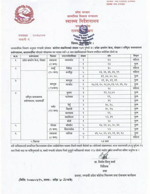 प्रदेश क्षयारोग केन्द्र, पोखरा र राष्ट्रिय जनस्वास्थ्य प्रयोगशाला काठमाडौंमा गरिएको परीक्षणका क्रममा थप ५३ जनामा कोरोना संक्रमण देखिएको सामाजिक विकास मन्त्रालय गण्डकी प्रदेशले जनाएको छ ।