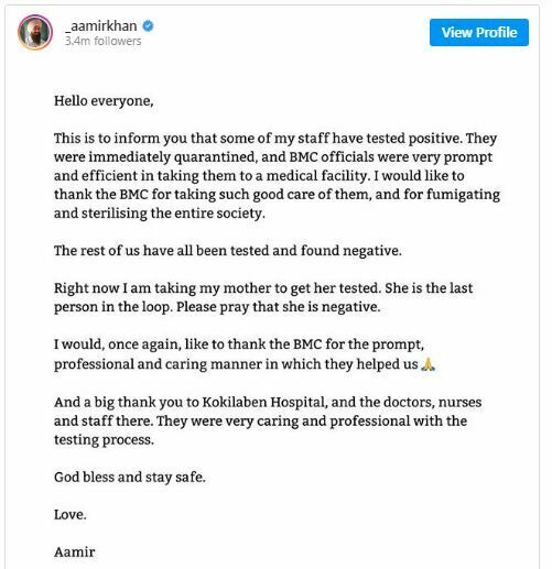 आमिर खानले कर्मचारी पोजेटिभ पाएपछि बीएमसीद्वारा लिइएको एक्सनबारे पनि लेखेका छन् ।