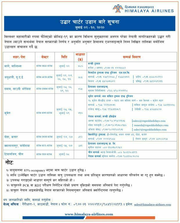 यी उडानमा आउने यात्रुले पीसीआर वा आरडीटी परीक्षण नेगेटिभ रहेको प्रमाण बुकिङको समयमा अनिवार्य पेश गर्न आग्रह गरेको छ । हिमालयले जुन महिनामा पनि १० दिन चार्टर्ड उडान गरेको थियो ।