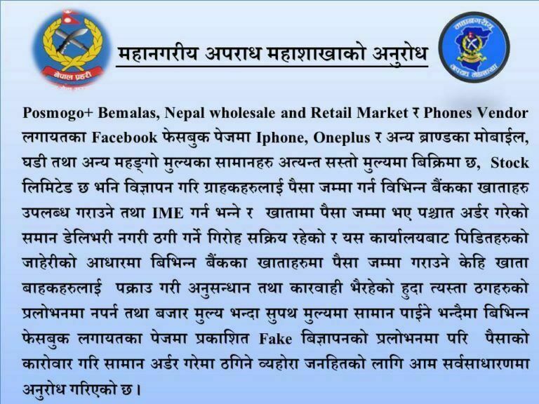काठमाडौं । विभिन्न फेसबुक पेजबाट महँगा मोबाइल फोनको विज्ञापन गरेर ग्राहबाट ठगी गर्ने गिरोह सक्रिय भएको पाइएको छ । प्रहरीले यस्तो ठगी गर्ने गिरोहबाट सचेत रहन अपील गर्दै सचेत रहन अपील गरेको छ ।