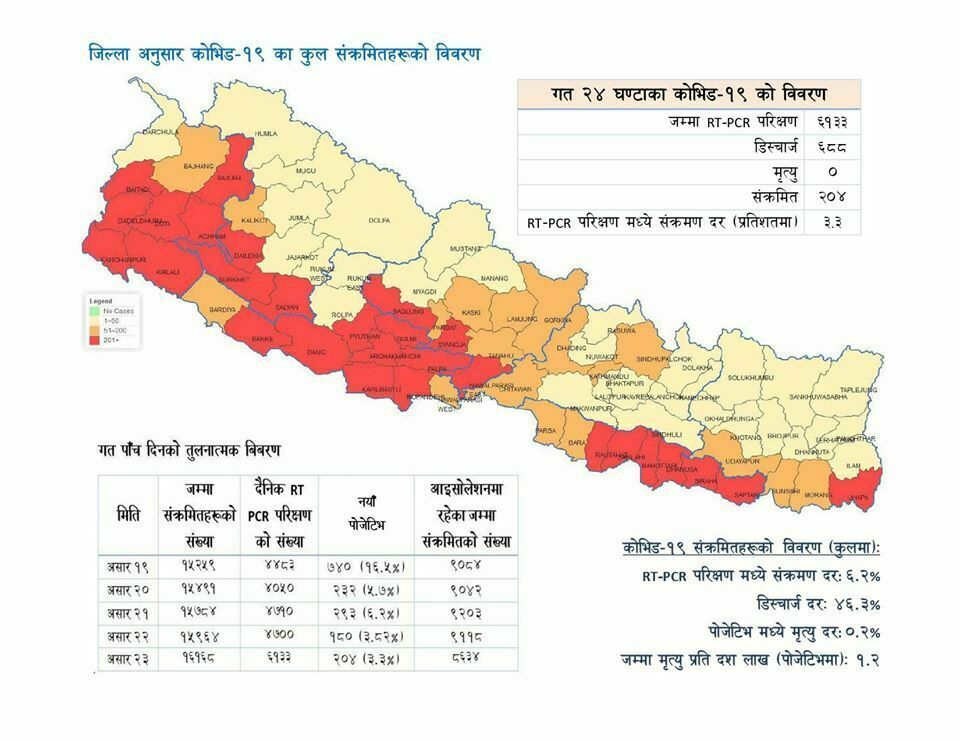 प्रदेश नम्बर २ का महोत्तरी र रौतहट, प्रदेश नम्बर ५ को पाल्पा र सुदूरपश्चिम प्रदेशको अछाम कैलाली र बाजुरामा ५ सय भन्दा बढी संक्रमित आइसोलेसनमा उपचाररत रहेका छन् । नेपालका ४ जिल्ला तेह्रथुम, भोजपुर, सोलुखुम्बु र हुम्लामा संक्रमितको संख्या शून्य रहेको छ ।