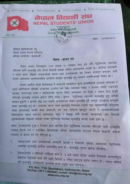 लकडाउनको अवधिमा मात्र ३ अर्ब नाफा कमाएको नेपाल आयल निगमले अन्तर्राष्ट्रिय बजारमा थोरै मूल्य बढ्ने वित्तिकै ५ रुपैयाँ बढाउनु गलत भएको भन्दै ज्ञापन पत्र बुझाएको हो । नाफा सञ्चित गरी मूल्यवृद्धि उपभोक्ताको थाप्लो हाल्ने प्रवृति बन्द गर्न पनि नेविसंघले माग गरेको छ । लकडाउनको समयमा उपभोक्ताको आम्दानी घटेको र रोजगारी गुमेको अवस्थामा पेट्रोलियम पदार्थको मूल्यवृद्धि आफैमा अमानविय कार्य भएकाले मुल्यवृद्धि तत्काल खारेज गर्न मागरिएको नेविसंघका महामन्त्री दिपक भट्टराईले बताए । नेविसंघले पेट्रोलियम पदार्थमा विभिन्न शीर्षकमा असुल्दै आएको कर समेत खारेज गर्न माग गरेको छ ।