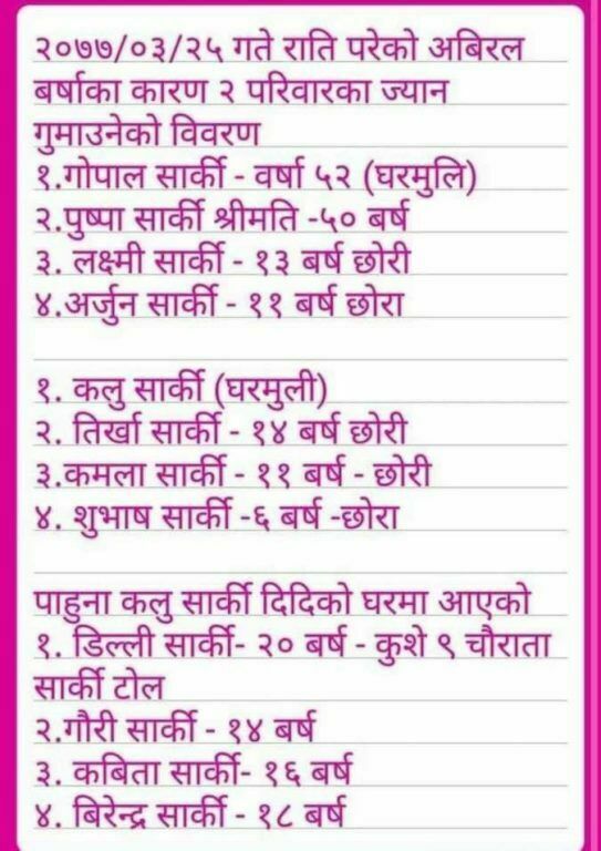त्यस्तै अन्य डिल्ली सार्की (२० वर्षीय), गौरी सार्की (१४ वर्षीया), कविता सार्की (१४ वर्षीया) र विरेन्द्र सार्की (१८ वर्षीय) रहेका छन् । उनीहरु चौतारा ९ कुशेटोल सार्कीगाँउबाट कलु सार्कीको घरमा पाहुँना लाग्न गएका थिए ।
