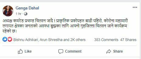 सामाजिक सञ्जाल फेसबुकबाट उनले जानकारी दिएकी छिन् – ” अध्यक्ष कमरेड प्रचण्ड चितवन जादै !  प्राकृतिक प्रकोपहरु बाढीपहिरो, कोरोना महामारीलगायत क्षेत्रका जनताको अवस्था बुझ्न आफ्नो गृहजिल्ला चितवन जाने कार्यक्रम रहेको छ ।”