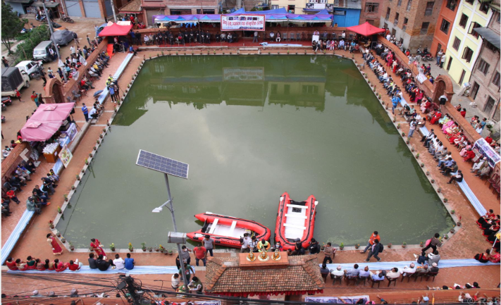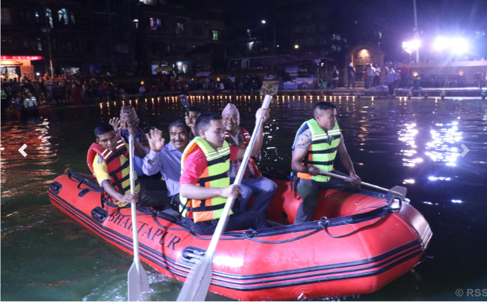भक्तपुर । साँझ ढल्कँदै थियो । वरिपरिको बत्तीको उज्यालोले पोखरी चम्किरहेको थियो । बाँसुरीको मनमोहक धुनले सन्ध्याकालीन माहोललाई उत्सवका रुपमा परिणत गरिरहेको थियो । बत्तीको उज्यालोले चम्किएको पोखरीमा राति पनि दुईवटा ढुङ्गा चलिरहेका थिए । पोखरीभित्र सीमित मानिस रहे पनि पोखरीबाहिर वरिपरि हेर्न स्थानीयवासीको बाक्लो उपस्थिति थियो ।
