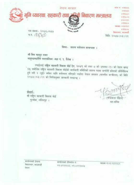 राष्ट्रिय सहकारी ऐन ४९ को दफा ७ को उपदफा-१ को देहाय खण्ड (ङ) बमोजिम दुइ वर्षको लागि रावतलाई बोर्डको सदस्यमा चयन गरिएको भुमि व्यवस्था सहकारी तथा गरिबी निवारण मन्त्रालयले जनाएको छ ।
