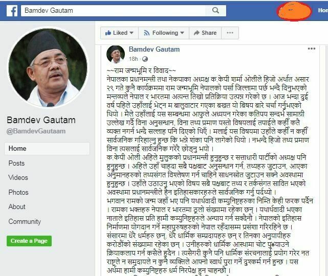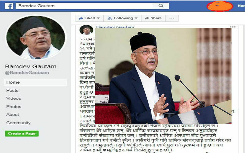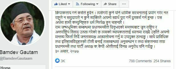 प्रधानमन्त्रीको यो अभिव्यक्तिलाई लिएर भारतीय मिडियाहरु निरन्तर ‘ब्रेकिङ न्यूज’ बजाईरहेका बेला सत्तारुढ नेपाल कम्युनिष्ट पार्टी नेकपाका नेता वामदेव गौतमले सामाजिक सञ्जाल फेसबुकमा एउटा पोष्ट गर्दै राम जन्मभूमिका सम्बन्धमा प्रधानमन्त्रीको अभिव्यक्तिपछि दुई वर्ष अघि नै यस सन्दर्भमा प्रधानमन्त्रीले बालुवाटार गएका बखत कुराकानी गरेको र आफूले सुझाव दिएको उल्लेख गर्दै लेखेका छन् – ”प्रधानमन्त्रीले दिनुभएको मन्तव्यबाट जुन राष्ट्रिय र अन्तर्राष्ट्रिय विवाद उत्पन्न गरेको छ, त्यसको व्यापकतालाई ध्यानमा राख्दै उहाँले आफ्नो मन्तव्य फिर्ता लिँदै जनतासमक्ष आत्मालोचना गर्नु म उपयुक्त ठान्दछु।”