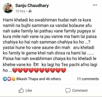 सामाजिक संजाल फेसबुक उनले भनेकी छिन् ‘हामी खेलाडीको स्वभिमान हुँदैन र ? कुरा नमिली नबुझी सम्मान छ भन्दै बोलाउने । आफु नसके परिवारको सदस्यलाई पठाउनु भन्ने । अनि परिवारको सदस्य पुगेपछि कुरा मिलेन भनेर जानु भन्ने, ? पैसा होइन स्वाभिमान चाहिएको हो । खेलाडीले खेल्ने भनेको देशका लागि हो उनले लेखेकी छिन् ।