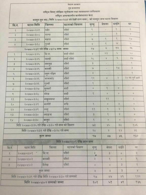गत जेठ ३१ देखी साउन १ गतेसम्मको तथ्यांक अनुसार बाढी पहिरोका कारण १ सय १ जनाको ज्यान गइसकेको छ । भने बाढी पहिरोमा ५१ जना बेपत्ता, ४९ जना घाइते र १३६ घरमा क्षति पुगेको राष्ट्रिय विपद् जोखिम न्यूनिकरण तथा व्यवस्थापन प्राधिकरणले जनाएको छ ।