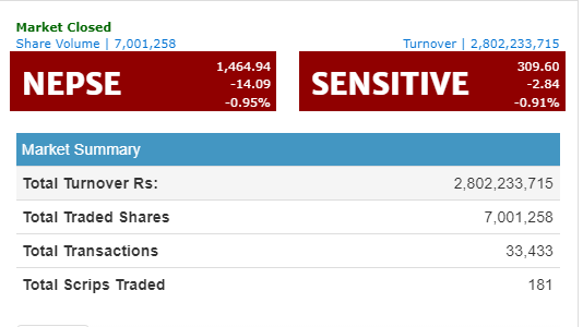 आज नेप्सेमा २ अर्ब ८० करोड रुपैयाँको कारोबार भएको छ। जसमध्ये बैंकिङ समूह ३, विकास बैंक १६ र फाइनान्स १ अंकले बढेका छन् । भने व्यापार ३७, होटल ६६, जलविद्युत १२, निर्जीवन बीमा समूह ४१, उत्पादन १२७, अन्य २२, माइक्रोफाइनान्स ८७, जीवन बीमा समूह १८८ अंकले घटेको नेप्सेले जनाएको छ ।