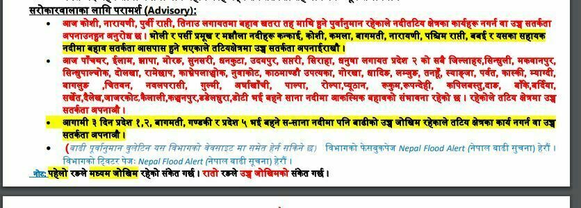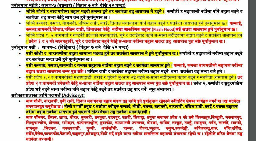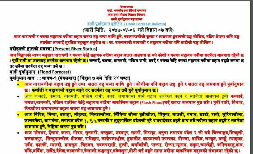 नारायणीमा बहाब उच्च हुने तथा खतरा तह भन्दा माथि हुने । कोशीमा पवन बहाब उच्च हुने र खतरा तह आसपास हुने पूर्वानुमान छ ।