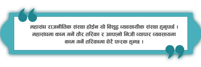 त्यसैले महासंघ राजनीतिक संस्था होइन, यो हाम्रो वस्तुनिष्ठ व्यावसायिक संस्था हुनुपर्छ । नेपाल सरकारलाई उचित सल्लाह दिएर क्षेत्रगत रुपमा सामाजिक र राष्ट्रकै विकासमा ठूलो योगदान गर्ने निजी क्षेत्र भएको हुनाले त्यो दिशामा जाने हो । प्रोफेसनल संस्था बनाएर राजनीतिमुक्त संस्था बनाउने मेरो व्यक्तिगत सिद्धान्त र उद्देश्य हो । व्यक्तिगत भने पनि टिमको कुरा आइहाल्छ । टिम पनि यही सोच भएका साथीहरु हुनुहुन्छ, जो परिवर्तन चाहन्छन् । नेता भए भनेर सबैले नमस्कार गरे भन्दैमा धाग देखाउने त होइन नि ? तपाईं अध्यक्ष भन्नुस्, उपाध्यक्ष भन्नुस्, सबैसँग झुकेर सबै साथीहरुको सेवामा लाग्ने हो । त्यो हो मेरो लागि नेतृत्व । हामी सेवक नेतृत्वको सोचमा छौं । त्यसैले हामी सबै साथीहरुको जहाँ समस्या छ, जहाँँ अफ्ठ्यारो परिरहेको छ । त्यो एजेण्डा बोकेर आगाडि बढ्छौं र सम्बन्धित सरकारी निकाय, सम्बन्धित संघ–संस्थामा गएर समस्या समाधान गर्ने र महासंघको गरिमा अझै उच्च बनाउने उद्देश्यले म र हाम्रो इन्टायर टिम लागेको छ ।