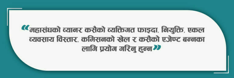 महासंघको व्यानर कसैको व्यक्तिगत फाइदा, नियुक्ति, एकल व्यवसाय विस्तार, कमिसनको खेल र कसैको एजेण्ट बन्नका लागि प्रयोग गरिनु हुन्न । समग्र निजी क्षेत्रलाई समय सापेक्ष रुपमा पर्ने असर र समस्या समाधान गर्दै अवसरहरुको अधिकतम सदुपयोग गर्ने गराउने किसिमको सकरात्मक सोच महासंघ नेतृत्वमा हुनुपर्छ ।