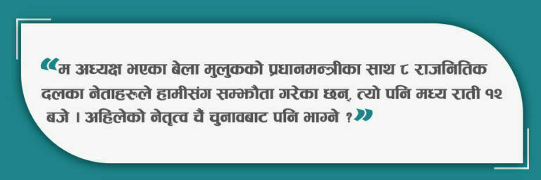 म अध्यक्ष भएका बेला मुलुकको प्रधानमन्त्रीका साथै ८ राजनीतिक दलका नेताहरुले हामीसँग सम्झौता गरेका छन्, त्यो पनि मध्य राति १२ बजे । जसले कतिपय समस्याग्रस्त अवस्थामा रहेका उद्योगहरु रिभाइभ भएका थिए । अहिलेको नेतृत्व चुनावबाट पनि भाग्ने ? अबको नेतृत्वले आफूलाई ठूलो व्यावसायिक घराना भन्दै गर्दा महासंघलाई बलियो बनाउँदै संस्थाको आधारलाई बलियो बनाउने अभियानमा लाग्नै पर्छ ।