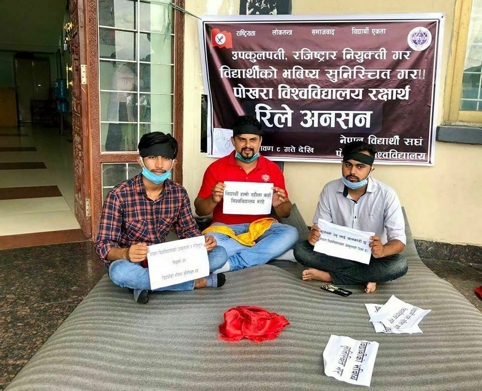 नेपाल विद्यार्थी संघ पोखरा विश्वविद्यालयका विद्यार्थी नेताहरु गोपी तिवारी, निरज लामिछाने र राजीव भण्डारीले रिले अनसन थालेका हुन् । आफूहरुको माग पूरा नहुँदासम्म अनसन जारी राख्ने राजीव भण्डारीले बताए ।