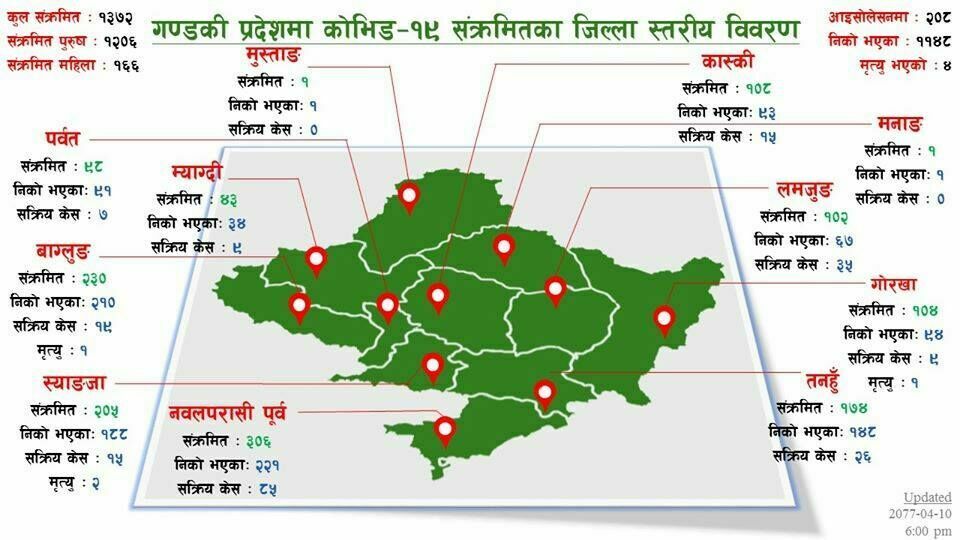 हाल यो प्रदेशमा आइसोलेशनमा २०८ जना रहँदा निको हुनेको संख्या ११४८ रहेको छ । यस्तै गण्डकी प्रदेशमा ४ जनाको मृत्यु भएको छ ।