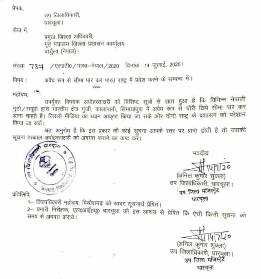 नेपालको राजनीतिक तथा प्रशासनिक भूभागअन्तर्गत रहेको गुन्जी, कालापानी, लिम्पियाधुरालाई ‘आफ्नो क्षेत्र’ उल्लेख गर्दै उक्त क्षेत्रमा नेपाली गुट/समूह अवैध रूपमा घुसपैठ गरिरहेको भन्दै उक्त आवागमनबारे सूचना दिन धार्चुलास्थित भारतीय प्रशासनले दार्चुला जिल्ला प्रशासनलाई ‘ध्यानाकर्षण पत्र’ पठाएको छ ।