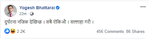 सामाजिक सञ्जालमा लेख्दै भट्टराईले पार्टी दुर्घटना नजिक रहेकाले सबै रोकिन र सल्लाह गर्न समेत आग्रह गरेका छन् ।