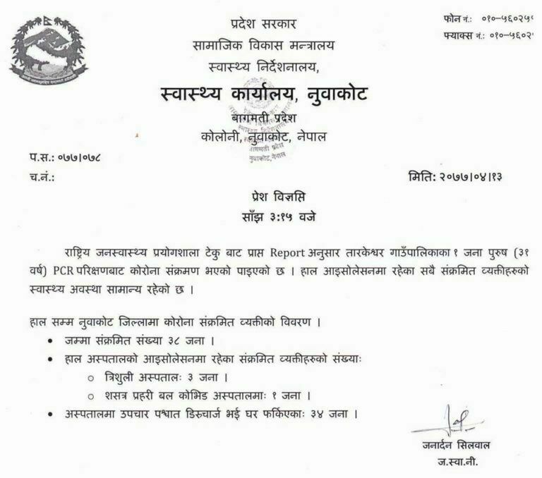 त्यससँगै नुवाकोटमा कोरोना संक्रमितको संख्या ३८ पुगेको छ ।