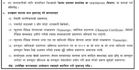आगामी भाद्र १० गतेको लागि लिखित परीक्षा तोकिएको छ । भने १८ वर्ष पुरा भइ ३५ वर्ष ननाघेकाहरुले मात्र दरखास्त दिन सक्नेछन् । विभागका अनुसार प्रवीणता पत्र तह वा प्लस टु पास गरेको हुनुपर्ने वा ३ महिना कम्युटर पढेको हुनुपर्नेछ ।