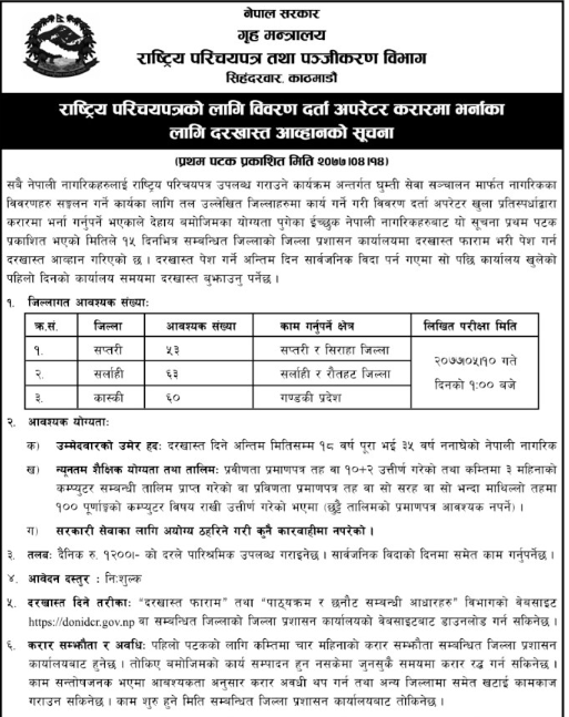 नागरिकहरुलाई राष्ट्रिय परिचयपत्र उपलब्ध गराउनको लागि घुम्ति सेवा सञ्चालन गर्न सप्तरी, सर्लाही र कास्कीका लागि कर्मचारी माग गरेको हो । राष्ट्रिय परिचयपत्र तथा पञ्जिकरण विभागले आज एक सूचना जारी गर्दै सम्बन्धी जिल्ला प्रशासन कार्यालयमा दरखास्त दिन आह्वान समेत गरेको छ ।